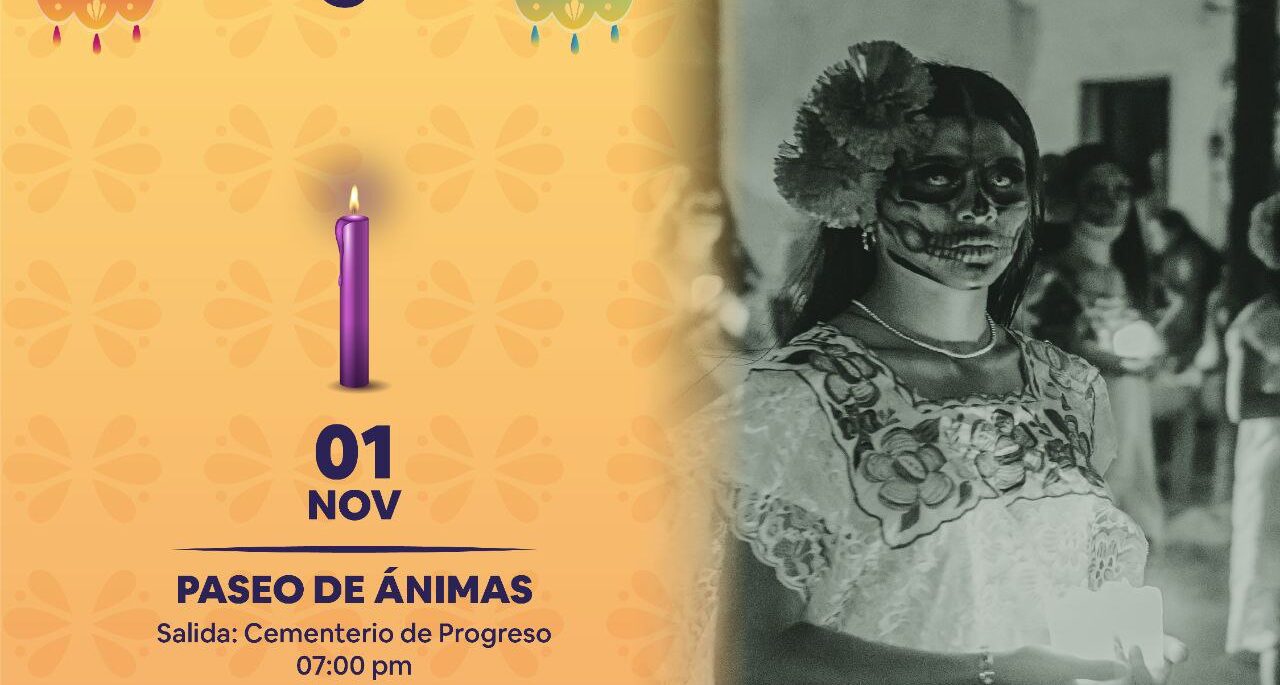 El Paseo de Ánimas iniciará en el cementerio municipal de Progreso y recorrerá la calle 33 hasta concluir en el Parque Independencia, donde el alcalde invita a las y los progreseños a armar su altar desde casa y compartir los recuerdos de sus seres queridos, o bien, a acompañar en el paseo portando vestimenta alusiva.