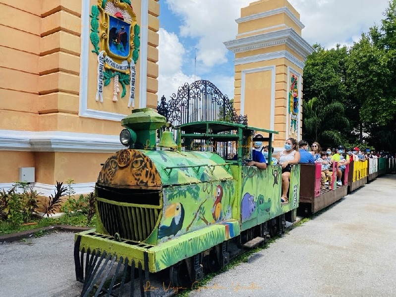 Mérida, Yucatán a domingo 26 de abril de 2026.- La locomotora de uno de los trenecitos del Parque Zoológico El Centenario sufrió un percance al salir de las rieles la mañana de este domingo debido al desprendimiento de la parte delantera conocida como “quita piedras”.