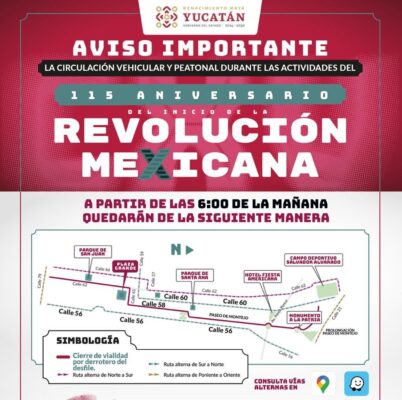 Mérida, Yucatán, a 19 de noviembre de 2025.- El Gobierno del Estado informa a la ciudadanía que, con motivo del desfile conmemorativo del 115 aniversario del inicio de la Revolución Mexicana, este jueves 20 de noviembre permanecerá cerrado el tránsito vehicular en diversas calles del Centro de Mérida.