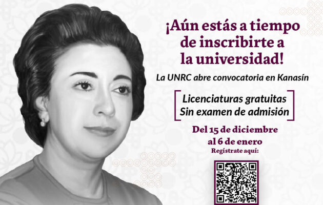 Mérida, Yucatán, a 30 de diciembre de 2025.- Con la finalidad de ampliar el acceso a la educación superior en 2026, el Gobierno del Estado informó que la Universidad Nacional Rosario Castellanos (UNRC), Unidad Kanasín, mantiene abierta su convocatoria de ingreso, con una oferta educativa gratuita, de calidad, con enfoque humanista y sin examen de admisión, dirigida a personas que concluyeron el bachillerato o se encuentran próximas a egresar.