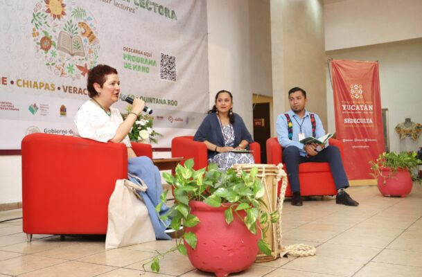 Ante las y los promotores de lectura provenientes de Veracruz, Chiapas, Tabasco, Campeche, Quintana Roo y diversos municipios de Yucatán, recordó que el material del libro surgió a través de entrevistas con personas de diversas partes del país, principalmente de comunidades originarias, que compartieron con ella historias que cruzan entre generaciones.