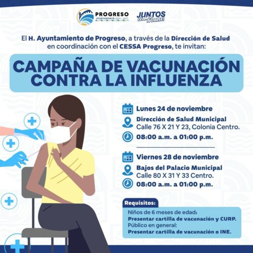 Progreso, Yucatán, 25 de noviembre de 2025.-El Ayuntamiento de Progreso invita a toda la población a participar en la Campaña de Vacunación contra la Influenza, realizada por la Dirección de Salud en coordinación con el Centro de Salud con Servicios Ampliados (CESSA).