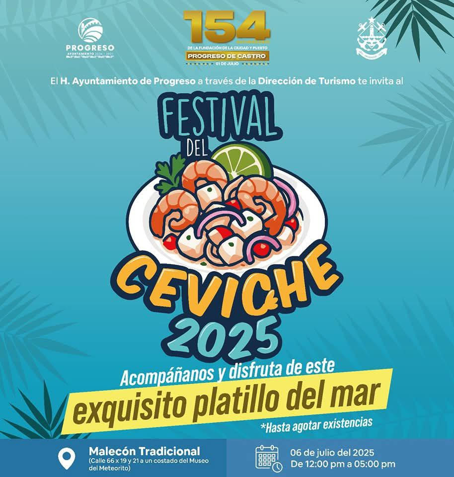 La directora de Turismo, Aurea Elena Gómez Novelo, destacó que el evento contará con la participación de 16 expositores, entre restauranteros y emprendedores locales, quienes presentarán diversas propuestas culinarias a base de ceviche, cada una con un sabor único. La cita será en el Malecón Tradicional calle 66 x 19 y 21, a un costado del Museo del Meteorito, de 12:00 p.m. a 5:00 p.m.