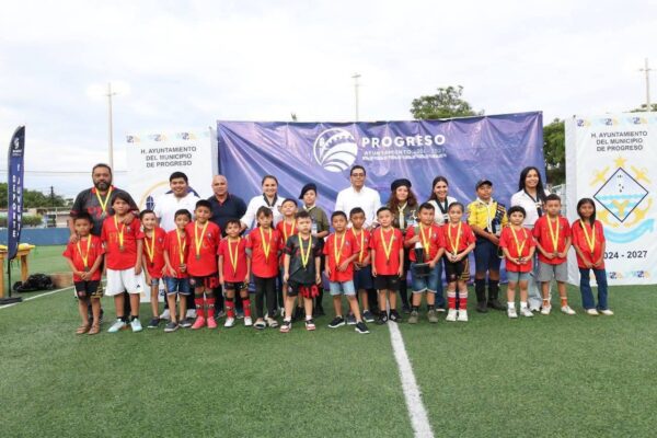 Progreso, Yucatán a 31 de julio de 2025.-Decenas de familias se reunieron la tarde de ayer en la Unidad Deportiva Morelos para apoyar una vez más a las futuras promesas del fútbol, durante la ceremonia de premiación de la Liga Municipal de Fútbol Infantil y Juvenil, promovida por la Dirección de Deporte y Juventud, en la que participaron 13 equipos.