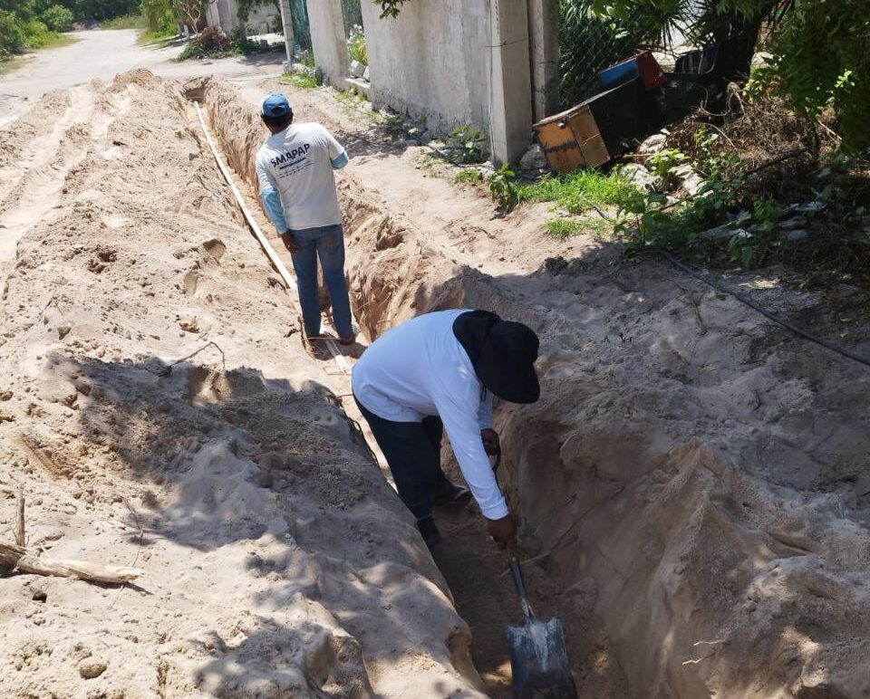 En el caso de Chicxulub Puerto, detalló que se realizan trabajos de rehabilitación de líneas sobre la calle 17, desde la 16 hasta la 4, interviniendo en calles blancas para reforzar la infraestructura existente y garantizar mejor presión y continuidad en el servicio.