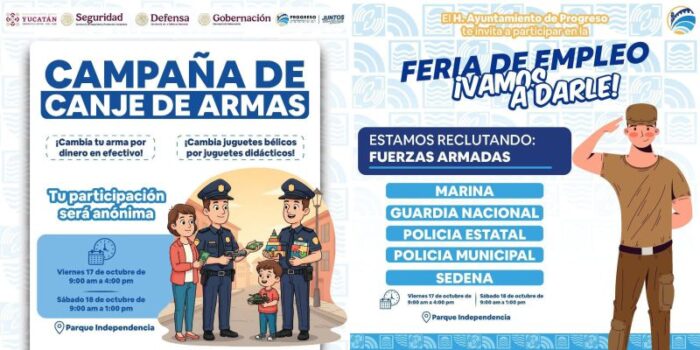Progreso, Yucatán, a 09 de octubre de 2025.- Con el propósito de fomentar la responsabilidad cívica y fortalecer una cultura de paz, el Ayuntamiento de Progreso, en coordinación con el Gobierno del Estado y las Fuerzas Armadas, llevará a cabo las jornadas de Canje de Armas y Reclutamiento los próximos viernes 17 y sábado 18 de octubre.