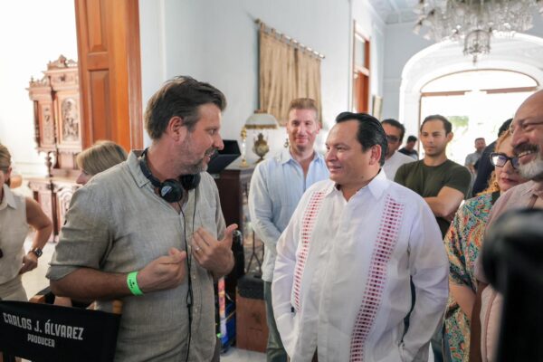 La comitiva fue recibida por el equipo de producción, ante quienes el Gobernador, acompañado por el secretario de Turismo, Darío Flota Ocampo, sostuvo una conversación detallada sobre el avance de la película y las condiciones de trabajo en las locaciones yucatecas, destacando el profesionalismo del equipo y el potencial del estado para futuras producciones.
