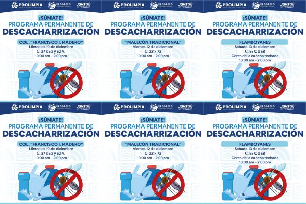 El director de Prolimpia, David Escalante, dio a conocer las próximas fechas y puntos donde se llevarán a cabo las jornadas de descacharrización, todas en un horario de 10:00 a.m. a 2:00 p.m. Asimismo, invitó a la ciudadanía a mantenerse atenta a las redes oficiales del Ayuntamiento para conocer futuras rutas y fomentar una participación activa.