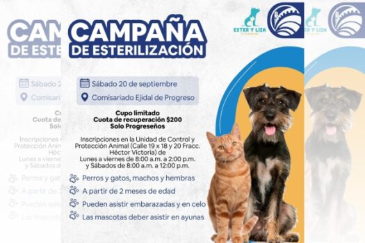 Progreso, Yucatán, a 4 de septiembre de 2025.-Con el objetivo de fomentar el bienestar de las mascotas, el alcalde Erik Rihani, a través de la Unidad de Protección y Control Animal en coordinación con la Dirección de Pesca, invita a participar en la Campaña de Esterilización Canina y Felina a bajo costo, que se llevará a cabo el sábado 20 de septiembre.