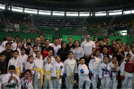 Samantha Desiderio Olvera, presidente nacional de este deporte con el entrenador Gustavo Cuevas Rocher, presidente de la Asociación para el Desarrollo e Impulso del Karate de Alto Rendimiento en Yucatán; Octavio de la Torre D´Stefano, presidente de la Cámara Nacional de Comercio, promotor del karate en México y Armin Lizama Córdova, director del Instituto del Deporte estuvieron en la inauguración de este certamen este domingo por la mañana, ya que todo el día hubo competencias en categorías de manera escalonada, de tal forma que no todos los participantes estuvieron presentes al mismo tiempo.