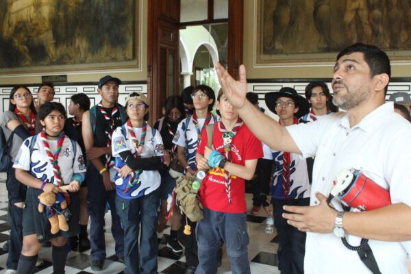 Mérida, Yucatán, a 25 de julio de 2025.- La Secretaría de la Cultura y las Artes (Sedeculta) acompañó a más de 600 niñas, niños y adolescentes de la Asociación de Scouts de México —provenientes de Puebla, Jalisco, Estado de México, Michoacán, Ciudad de México, entre otras entidades— durante un recorrido por el Palacio de Gobierno, sede del Poder Ejecutivo estatal, como parte de las actividades educativas y culturales del encuentro nacional escultista Mayamboree 2025, que se celebra en Yucatán.