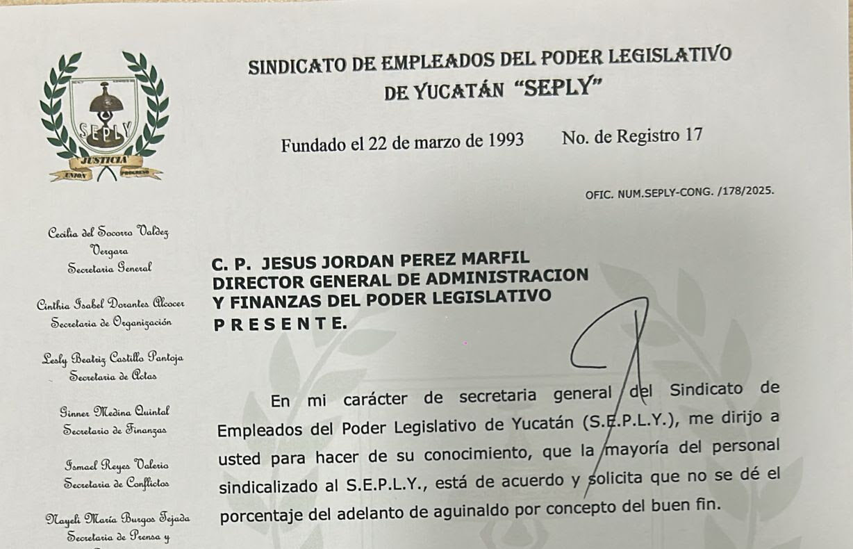Tanto el Sindicato de Empleados del Poder Legislativo (SEPLY) como el Sindicato de Trabajadores Unidos al Poder Legislativo de Yucatán (SITUPLEY) notificaron por escrito a la Dirección de Administración que, tras consultar a sus agremiados, éstos prefieren recibir la prestación completa en la fecha regular del pago de aguinaldo, conforme marca la normatividad.