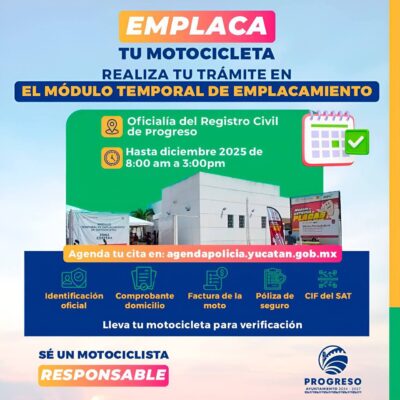 Progreso, Yucatán, 24 de noviembre de 2025.-El Ayuntamiento de Progreso, a través de la Dirección de Seguridad Pública y Tránsito (DSPT), reiteró su llamado a las y los motociclistas del municipio a realizar el trámite de regularización de sus vehículos en el Módulo de Emplacamiento Temporal, el cual permanecerá en operación hasta diciembre de 2025.